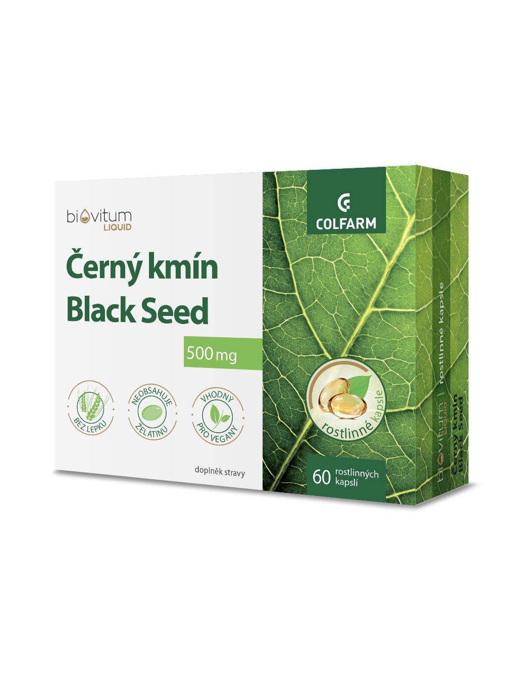 COLFARM Černý kmín Black seed je doplněk stravy s recepturou založenou 100% na složkách přírodního původu. Olej z černého kmínu je uzavřený ve speciálních měkkých kapslích vyrobených výhradně z rostlinných materiálů, takže je tento doplněk stravy vhodný i pro vegany. Olej ze semen černého kmínu lisovaný za studena Je bohatý na nenasycené mastné kyseliny, včetně kyseliny linolové a olejové. Kyselina linolová LA (omega-6) pomáhá snižovat hladinu cholesterolu v krvi. Příznivý účinek nastává při konzumaci 10 g LA denně.