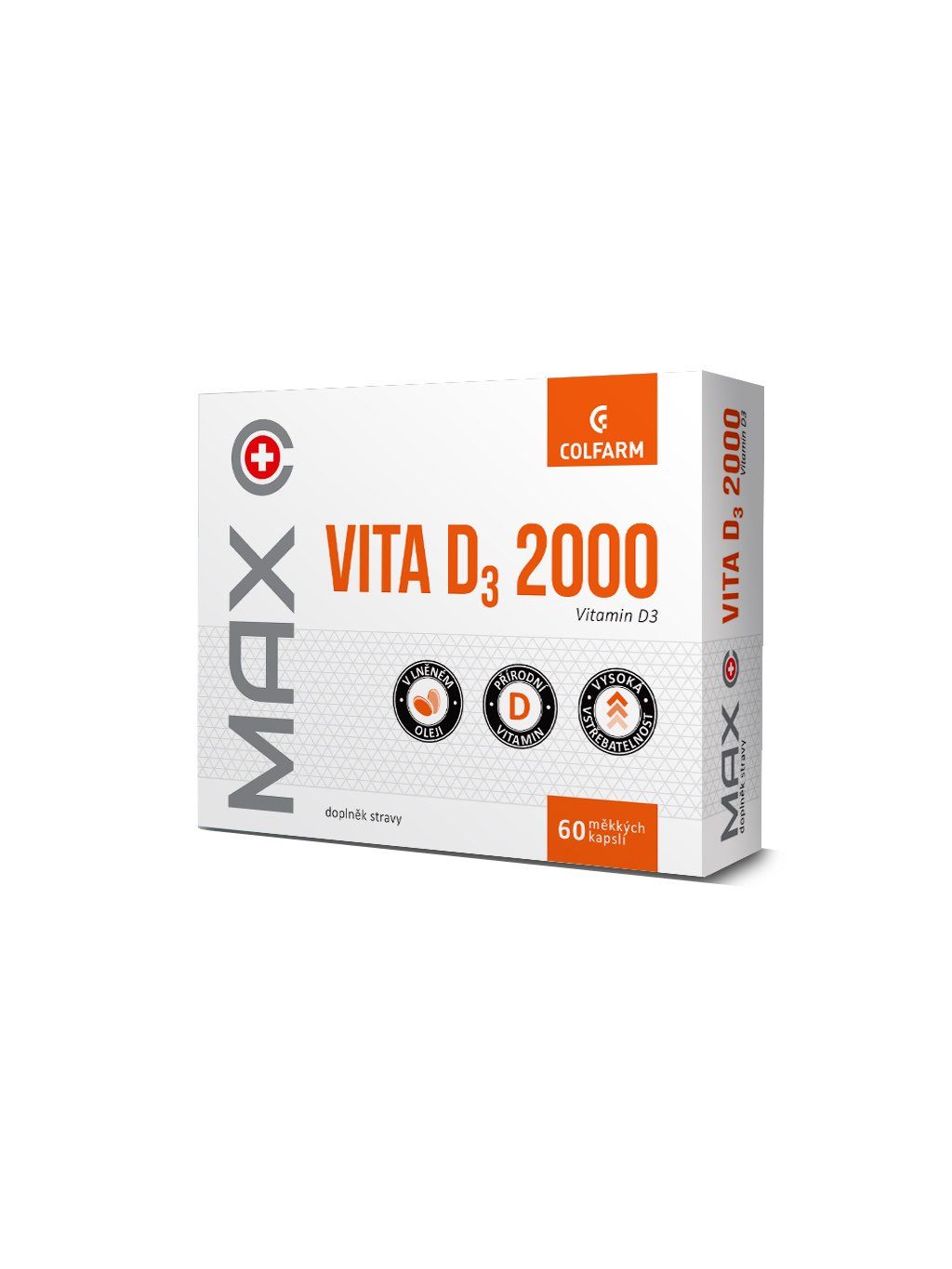 Zdravé kosti, zuby, svaly a imunita. Vitamin D je nezbytný pro správné fungování organismu. Tělo produkuje přírodní vitamin D syntézou kůže působením slunečního záření. Při nedostatečném pobytu na slunci, zejména v podzimních a zimních měsících, je dobré přijímat vitamin D v potravě. S přibývajícím věkem také klesá schopnost organismu vitamin D vytvářet. Přípravek COLFARM Max Vita D3 2000 obsahuje přírodní vitamin D (cholekalciferol) ve formě měkkých kapslí s rostlinnými oleji. Vitamin D je v tucích rozpustný vitamin. Díky olejové bázi uvnitř tobolky, se tak lépe vstřebává do organismu.