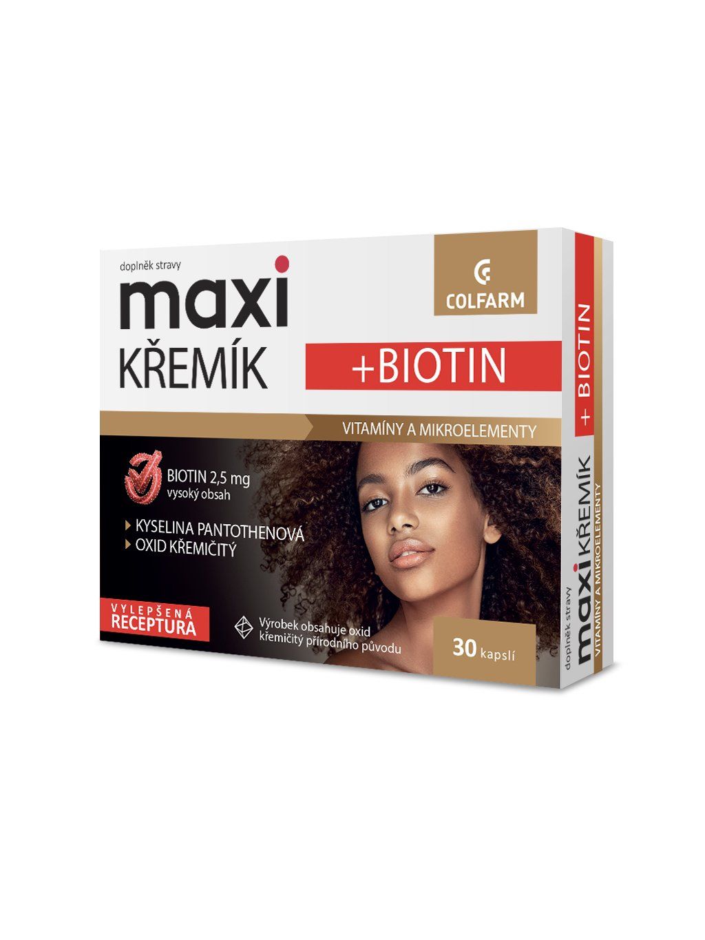 COLFARM Maxi Křemík + Biotin je doplněk stravy s kombinací biotinu, oxidu křemičitého, kyseliny pantotenové a výtažků z přesličky a kopřivy, které vám zajistí krásné vlasy a nehty. Jedna kapsle obsahuje přes 45 mg oxidu křemičitého získaného z rostlinných extraktů. Biotin má příznivý účinek na pokožku těla a přispívá k udržení zdravých a krásných vlasů. Zinek a selen mají pozitivní vliv na správný stav vlasů a nehtů. Měď přispívá ke správné pigmentaci pokožky a vlasů. Jód přispívá k udržení správného stavu pokožky. Doplněk stravy COLFARM Maxi navíc obsahuje vitaminy C, B1, B2, B3, B12, E a kyselinu listovou.
