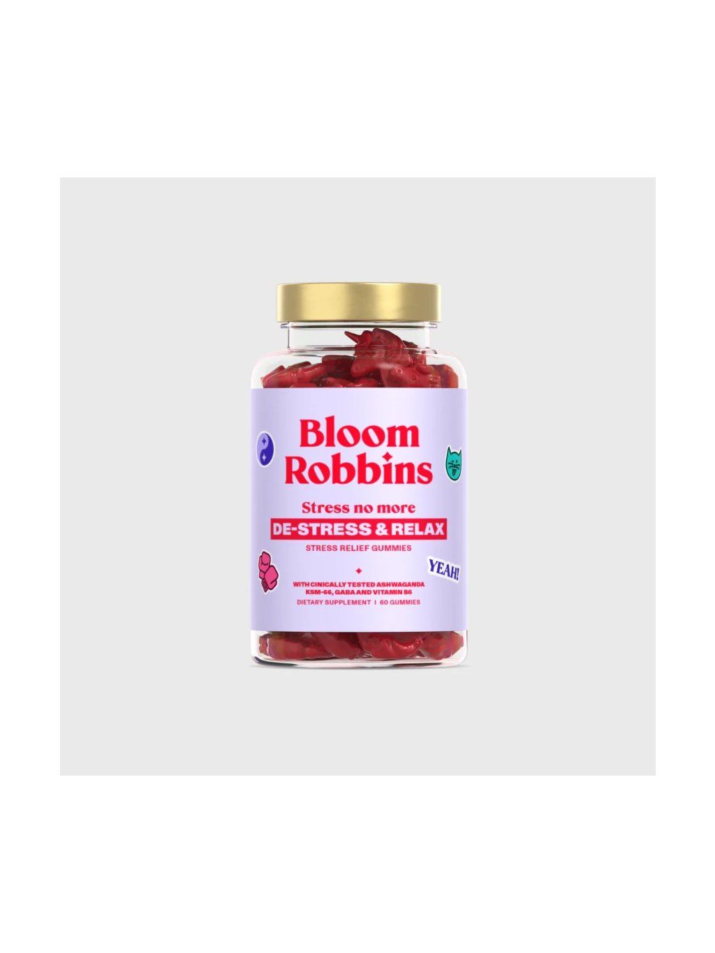 (3 g): Glukózový sirup, cukr, voda, výtažek z kořene Ashwagandha (Withania Somnifera), kyselina citrónová E-330 (kyselina), želírovací látka (pektin E-440), extrakt z meduňky lékařské (Melissa officinalis), antokyany E-163 (barvivo), přírodní aroma (lesní ovoce), rostlinný olej (kokosový), citrát trisodný E-331 (regulátor kyselosti), GABA (kyselina gama-aminomáslová), pyridoxin HCL, karnaubský vosk E-903 (protihrudkující látka)